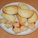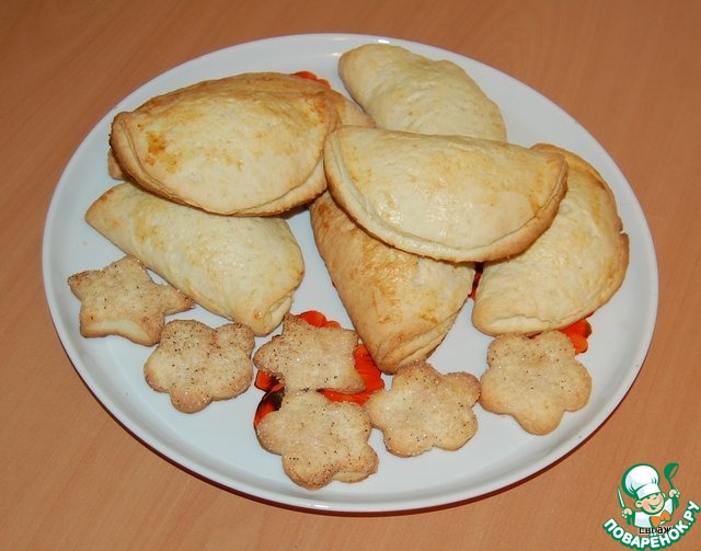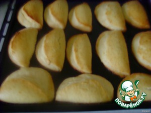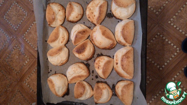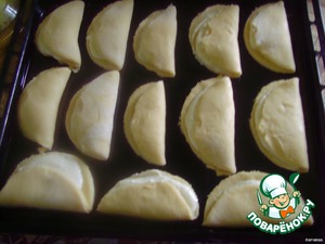 Духовку нагреваем до 180 градусов, противень смазываем растительным маслом, выкладываем сочни на противень, смазываем желтком, взбитым с 3 ст. л. молока и отправляем в духовку на 25 -30 минут.