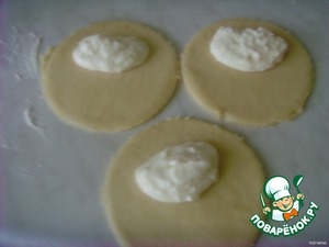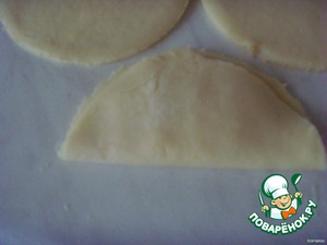 Тесто выкладываем на припыленный мукой стол, раскатываем толщиной 0, 3 мм., вырезаем кружки диаметром 12 см, на каждый кружок выкладываем по 1 ст. л. начинки, прикрываем, защипывать не нужно.