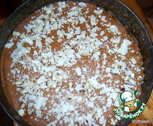 По истечении времени вынимаем из духовки и, пока верх еще мягкий, украшаем кусочками ореха. Легонько нажимаем рукой, чтобы орехи как-бы осели в начинку. Сначала даем пирогу остыть в комнатной температуре, потом ставим в холодильник еще на 3 часа.