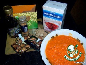 В это время делаем начинку. Вот все основные ингредиенты: соевое молоко (у меня порошок), крахмал,тыквенное пюре, 1/2 стакана кленового сиропа (у меня золотистый со вкусом кленового сиропа), имбирь, 1 1/2 ч.л. корицы, 1/2 ч.л. соли, молотый мускатный орех и молотая гвоздика.
