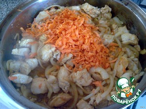 Обжариваем филе на разогретой сковороде. Добавляем нарезанный полукольцами лук.