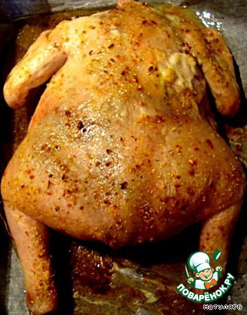 И начиняем курочку. Разрез нужно зашить, либо скрепить зубочистками. Смазать майонезом или сметанкой, подливаем на противень не много вина - и в духовку. Курочку можно посыпать любимой приправкой. Запекаем до красивой золотистой корочки.