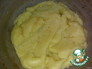 • В кастрюльку вылить стакан воды, поставить на небольшой огонь, положить масло или маргарин, щепотку соли, дать закипеть. Огонь убавить до минимума (я делаю на самой маленькой конфорке). После закипания при постоянном помешивании всыпать стакан муки и быстро вымешать, чтобы не было комочков. И подержать на маленьком огне минуты 2-3 (помешивая), тесто как бы начинает пыхкать. Выключить огонь и остудить до теплого состояния