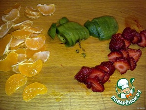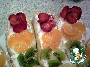 • На остывшие половинки пирожных намазываем нежный крем (полная чайная ложка) и укладываем фрукты в виде светофора: красный, желтый, зеленый