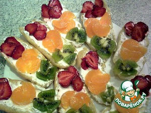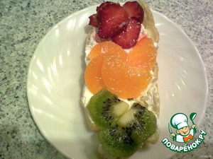 На остывшие половинки пирожных намазываем нежный крем (полная чайная ложка) и укладываем фрукты в виде светофора: красный, желтый, зеленый