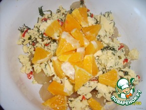 Режем апельсиновые кружочки на небольшие треугольнички, и добавляем к сыру и ананасам. Солим, перчим, выдавливаем чесночный зубчик, перемешиваем. В отдельной мисочке смешать майонез с компотом из ананасов, залить этой заправкой салат, перемешать.