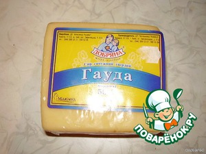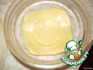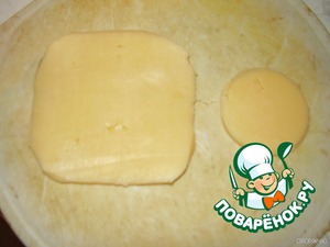 Теперь на дно мисочки кладем большой кусочек сыра, сверху маленький.