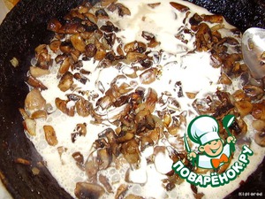 Добавляем в сковороду, заливаем сливками, перемешиваем и даем прогреться.