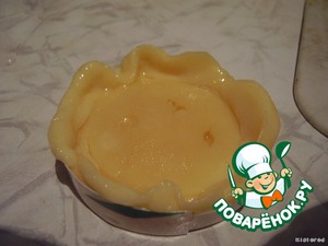 И перекладываем в формочку, придавая бортикам волны ( я использовала обрезанный одноразовый стаканчик), теперь отправляем эту кокотницу в холодильник для застывания.