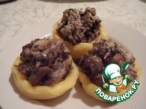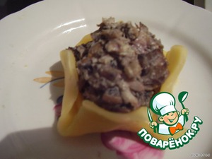 Готовую кокотницу выкладываем на тарелочку,заполняем остывшей начинкой, желательно перед подачей на стол, и угощаем гостей.