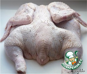 Курицу помыть, просушить бумажным полотенцем, посолить, поперчить, натереть натёртым чесноком, и оставить мариноваться на полчаса.