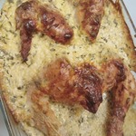 Достать курицу, обмазать сметанно-сырной смесью (под крыльями не мажьте, а то там не пропечется, и будет белая сыроватая смесь). -