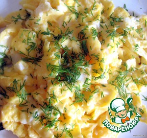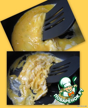 Разбить в миску 2 яйца, добавить сливки и слегка взбить вилкой, только чтобы яйца перемешались. Не солить!!! На разогретой сковороде распустить кусочки сливочного масла (1/2 количества масла). Готовить на слабом огне (у меня 1 деление), иначе яичная смесь быстро затвердеет и подгорит!!! Вылить взбитые яйца и дать массе чуть "схватиться".