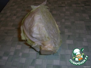 Все очень просто. Сначала разрезаем вилок капусты вдоль на 4 части. И разбираем капустку на листочки.