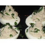 Фаршируй яйца щедро, с горкой. Можно украсить листиком петрушки.