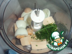 Берем сырок, яйца, чеснок, зелень и измельчаем все это в блендере. Если блендера нет, то трем на терку (сырок, яйца), зелень режем, а чеснок выдавливаем.