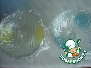 Берем креманки или широкие бокалы выстилаем пищевой пленкой, так чтоб края пленки немного свисали.