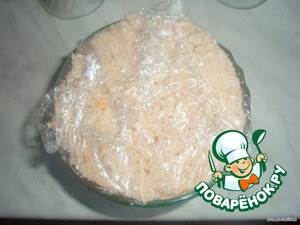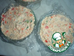 Сверху положить кусочек хлеба (не очень толстый), предварительно вырезанного по диаметру креманок. И немного, как бы придавить. Сверху прикрыть пищевой пленкой (как раз теми краями, которые остались свисать с креманок). И поставить в холодильник где-то минут на 20-30.
