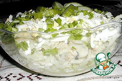 Если салат делается заранее, то последние два слоя - яйцо и лук - класть не нужно. Они за время настаивания завянут и заветрятся. Их нужно положить непосредственно перед подачей на стол.