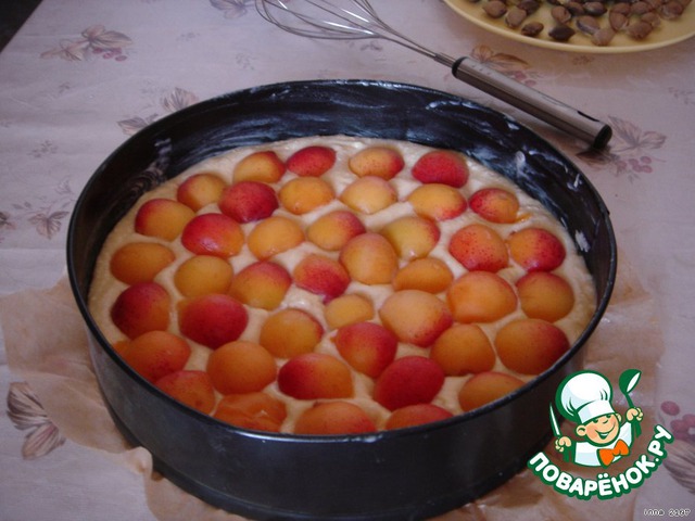Выложить тесто в форму, смазанную маслом. Добавить абрикосы, разделенные на 2 части и с удаленными косточками.