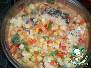 • Берём сковородку побольше, выкладываем в неё рыбу, заливаем маринадом, тушим минут 15, добавляем овощную смесь.