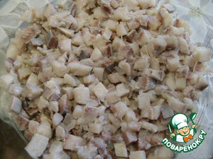 Укладываем слоями:1-ый слой:Сельдь порезанная кубиками.