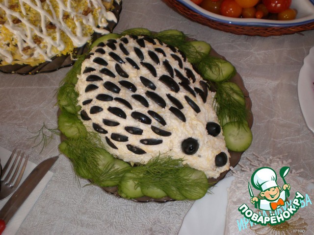 Смешать вместе: мелко порезанную отварную куриную грудку + конс. зелёный горошек +размятые вилкой желтки яиц + дольку чеснока + натёртый на крупной тёрке сыр. Заправить майонезом. Уложить горкой на тарелку. Сверху намазать смесью из: мелко натёртого сыра + яичного белка, заправленную майонезом. Разрезать маслины на 4 части, это и будут иголки. Так же вырезать из маслин кружочки, это глазки и носик. Получился Ёжик!