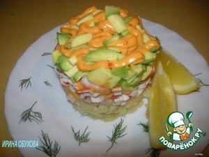 На тарелке установить сервировочное кольцо (у меня обрезанная пластиковая бутылка). 1 слоем выложить мелко нарезанный картофель,