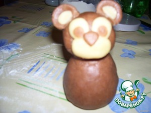 Из темного теста формируем голову медвежонка и садим ее на верхушку груши. Из кусочков темного теста делаем ушки. Из кусочков светлого теста делаем мордочку,кружки под глазки,кружки посредине ушек.на мордочку садим носик из темного теста.и на светлые кружочки для глаз прилепляем кружочки из темного теста меньшего размера.