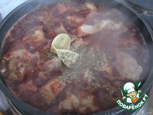 добавим вино, бульон, прованские травы, лавровый лист и тушим до готовности мяса. -
