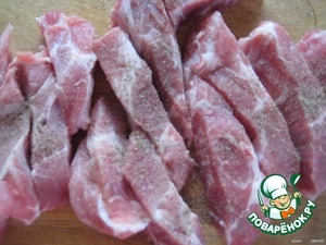 Мясо нарезаем крупной соломкой (как на бефстроганов).
