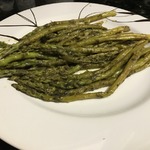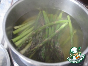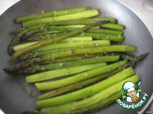 Воду сливаем и выкладываем спаржу в разогретую сковороду и слегка обжариваем без добавления масла (около 5 мин.).