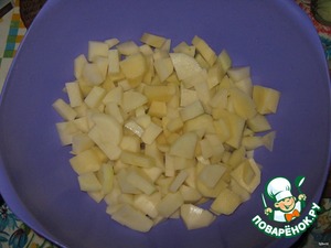 Режет картофель кубиками и кидаем к капусте, добавляем подсолнечного масла 3 ст. ложки; тушим мин 10.