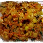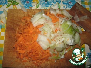Режем лук, трем на терке морковь (можно порезать соломкой), добавляем к овощам. Режем острый перец мелко (у меня была заготовка горького перца-я добавила из баночки 1,5 ст. ложки).