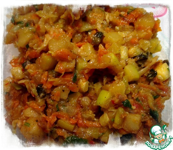 Затем начинаем сразу резать кубиками кабачок и кидаем к овощам, добавляем лавровый лист, черный перец по вкусу, чесночок давим и туда же))). Тушим до готовности.