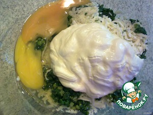 Смешиваем все ингредиенты в миске (вместо кефира можно добавить сметану).