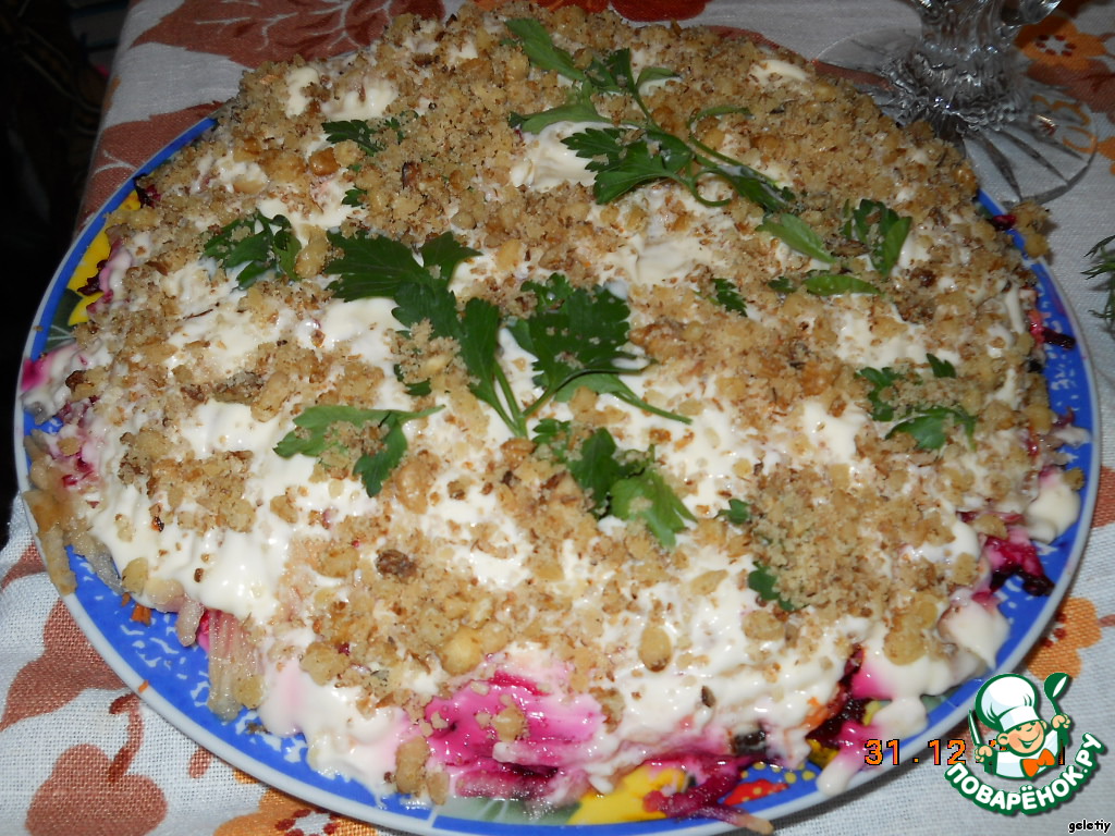 ОООчень вкусный салат -нежный и точно как торт,т.е. не возможно оторваться! Спасибо за рецепт!!