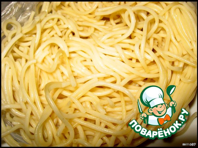 Спагетти выкладываем кольцом, в центр выкладываем соус...