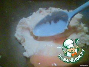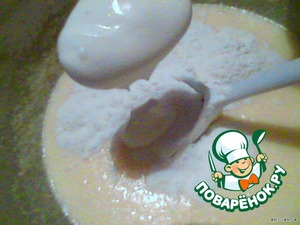 Разрыхлитель перемешайте с мукой и поочередно со сметаной добавьте в яично-маслянную смесь (1 ст.л. муки, 1 ст.л. сметаны и т.д.).