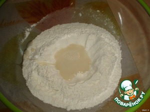 Насыпем муку в миску и сделаем углубление в середине.Нальем чуть воды и начнем замешивать тесто.Так постепенно вольем всю воду и замесим тесто