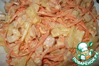Все продукты нарезаем соломкой, Добавляем майонез. Перемешиваем. -