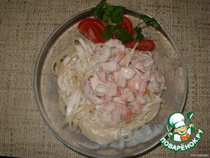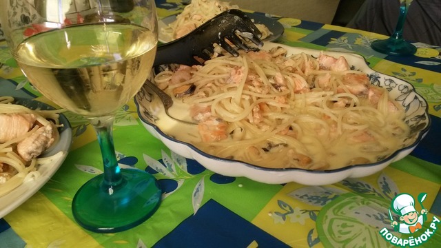 Выкладываем полученную смесь на отварные спагетти. Приятного аппетита))