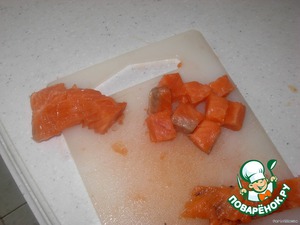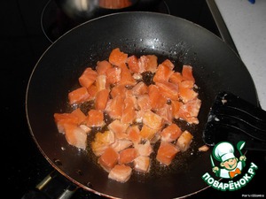 После того, как чеснок поджарился, выкидываем его (это масло). Кладем нарезанную семгу, жарим 5 минут.