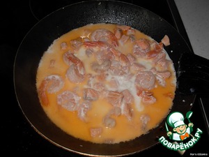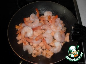 Затем добавляем креветки, жарим еще минут 5-7, если образовалось много жидкости, можно слить, но не всю.