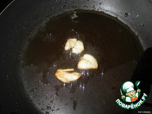 Обжариваем чеснок втечение 3-х минут. Главное, его не пережарить, а не то будет горчить. Пусть вас не пугает количество чеснока, впоследствии он все равно выкидывается, а масло, на котором он жарится приобретает необычный вкус.