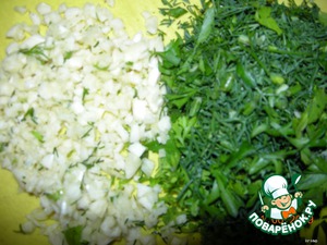 После чего заправляем, шафраном, перцем молотым, свежей мелко нарезанной зеленью, уксусом и растительным маслом, солим, добавляем щепотку сахара и измельченный чесночок.