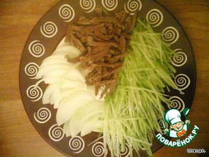Нарезать лук тонкими полукольцами. Зеленую редьку порезать тонкой соломкой. Отваренное мясо нарезать соломкой.