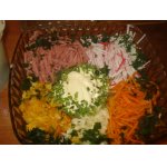Выложить в салатницу и залить соусом, приготовленным из майонеза и сметаны, готовой горчицы и измельченного чеснока.