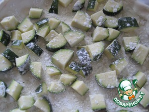 разложить нарезаные кубиками кабачки и обсыпать мукой.