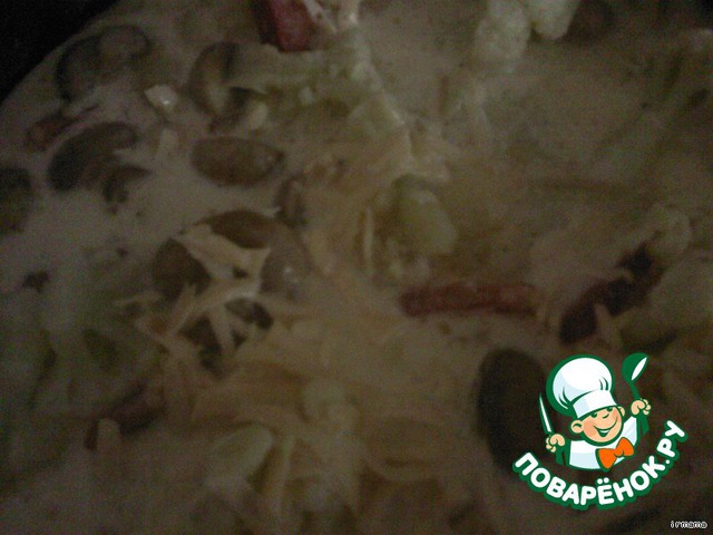 Готовим соус: взбиваем яйца, добавляем молоко, сметану и натертый сыр.